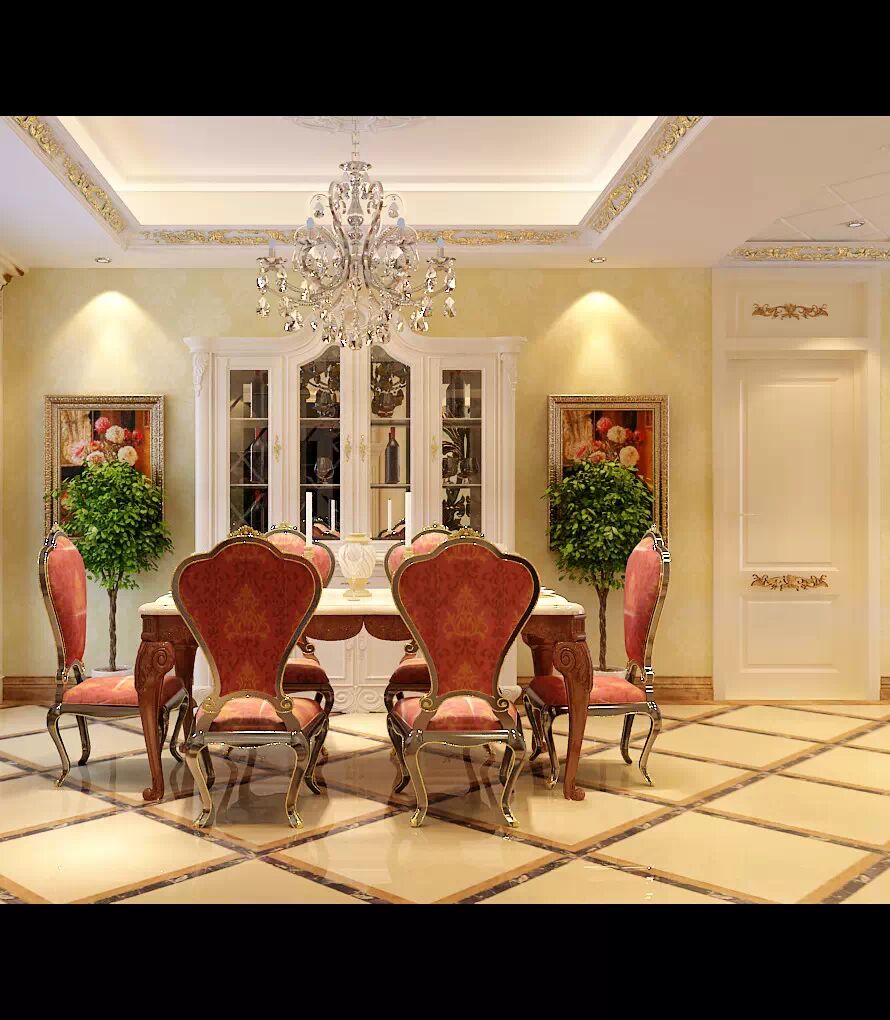 ▲白色古典线条的藏酒柜无疑是整个餐厅的一大亮点,与水晶吊灯及桌椅的线条相得益彰,柜子两旁的壁画及植物又为整个华美的餐厅添加了一分活泼。