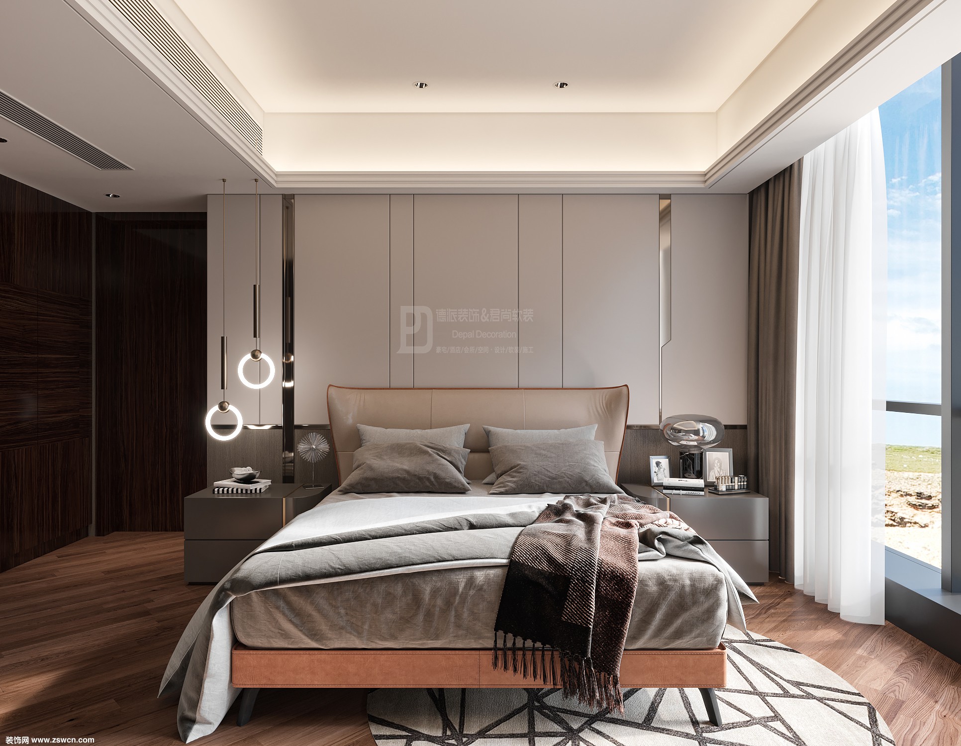 卧室整体大气温馨,家具搭配体现质感。独特的意大利极简线条的双人床,在方案沟通中,一下子就吸引了主人的眼球。成为整个卧室的亮点。硬装的线条与软装饰产生化学反应,营造温暖的实体感受。地板自然胡桃木质肌理及日趋沉着的色泽,让主人十分满意。