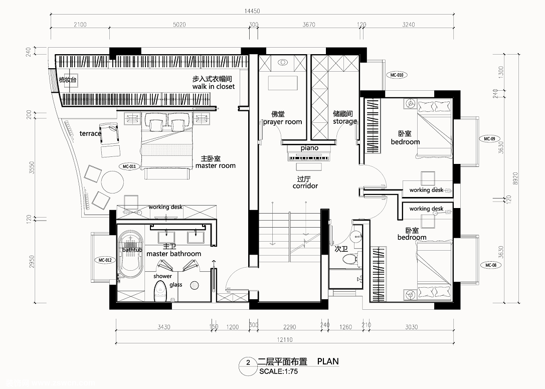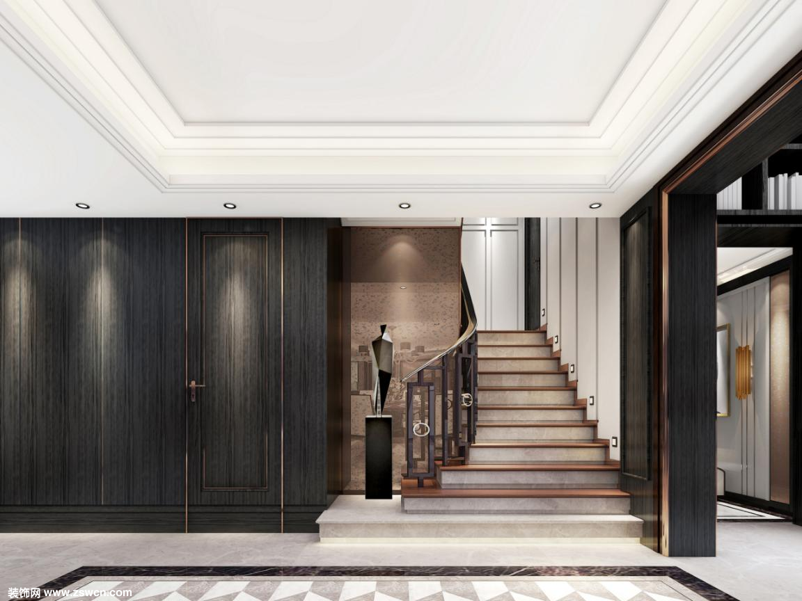 楼梯间白色的天花,黑色的墙壁,在冷暖色调中,采用黄铜色过度,在这样的色彩搭配下,给人舒适高级的感受