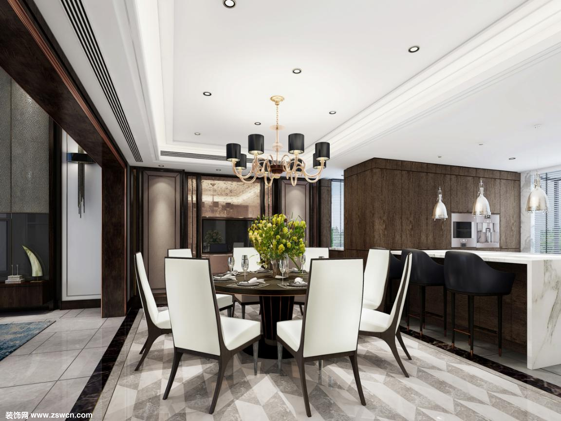 餐厅延续客厅的整体统一的格调,布置一台石材台面的圆餐桌,在白色餐椅环绕下,整体显得特别高级优雅
