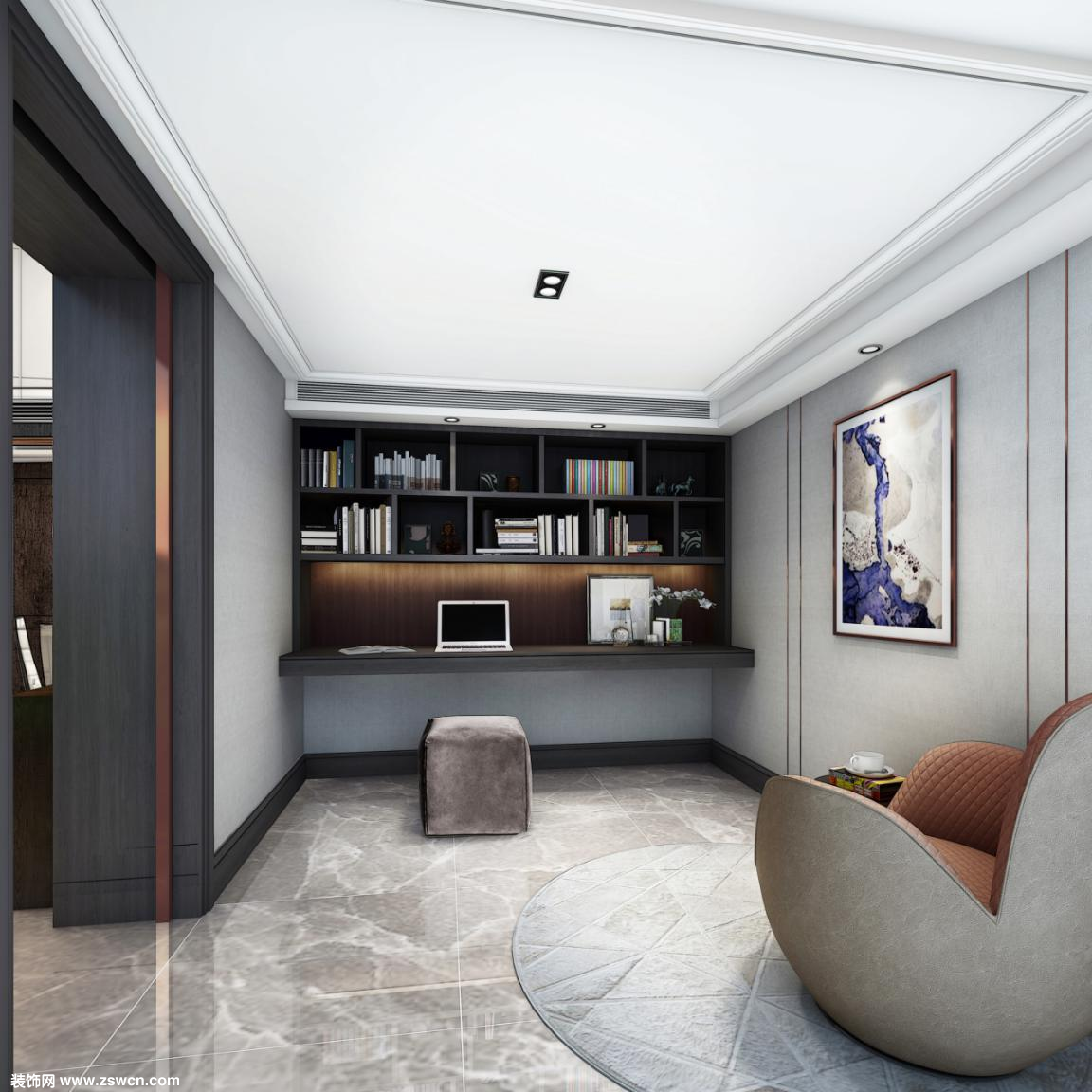 偏厅在角落设计书架,下面布置台面,放上凳子,形成办公区域,旁边一张卡其色沙发椅,提供一个工作与休闲兼具的多功能区域