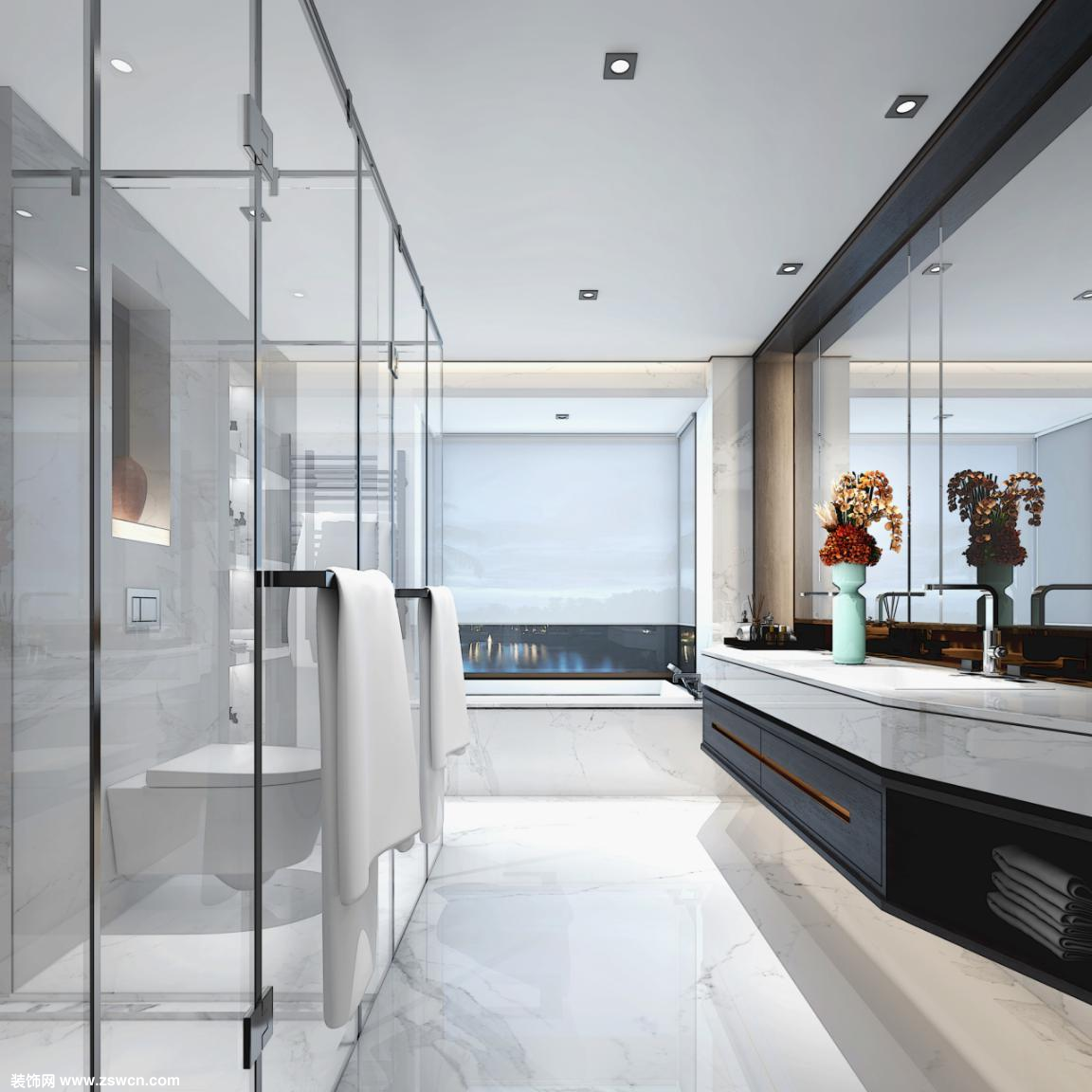 卫生间大面积使用白色大理石,洁净而透亮,一整块大镜子的使用,将空间折射的更加宽敞大气