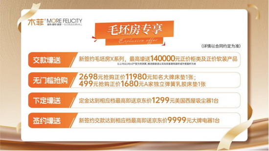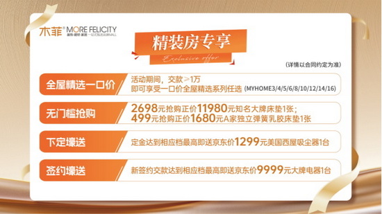 签约即送京东价最高 9999 元大牌电器;集团柜类、软装补贴,最高享集团补贴10%;